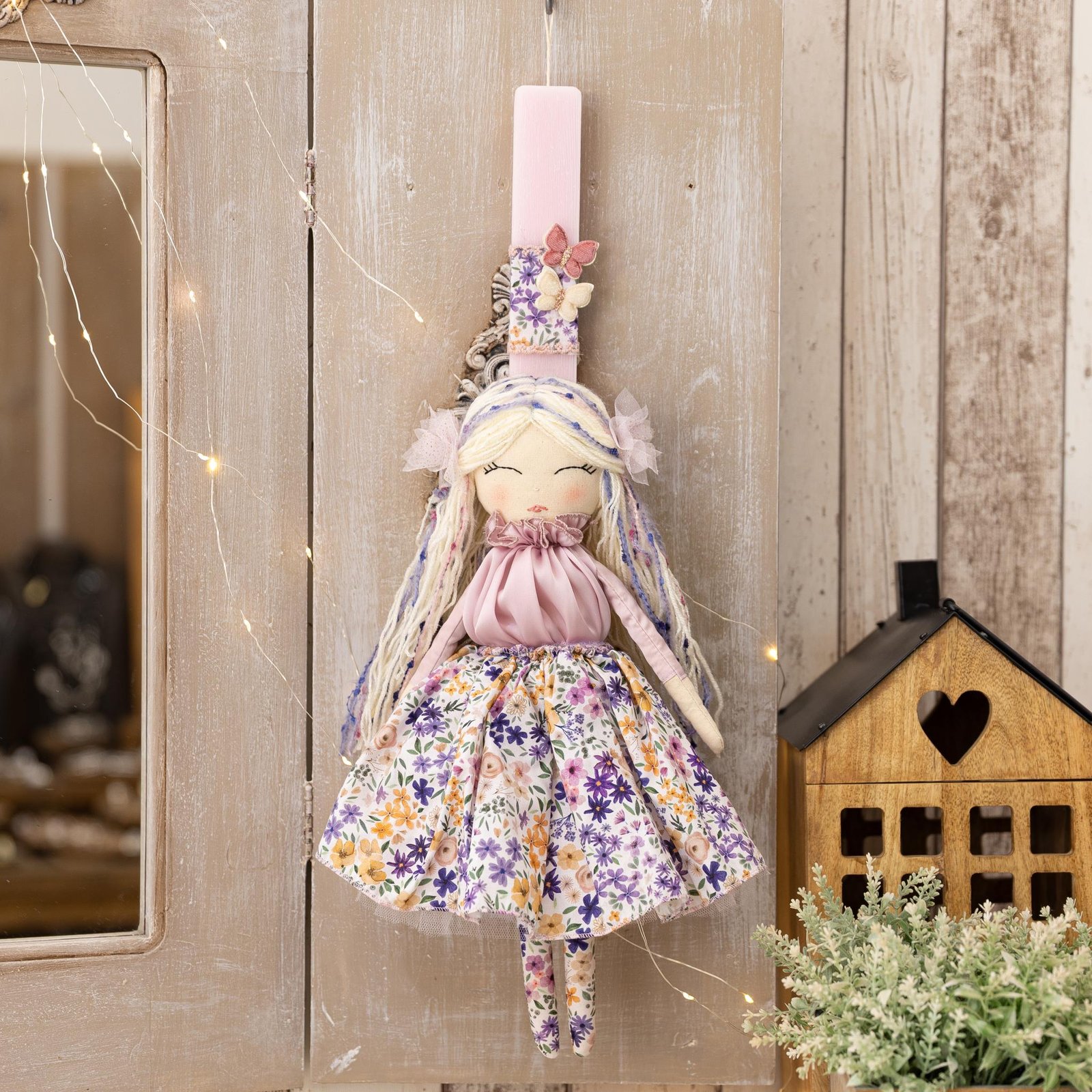 Παιδική λαμπαδα με χειροποίητη κούκλα στα 40 εκ.  περίπου, σε πλακέ αρωματικό κερί στα 34 εκ.
