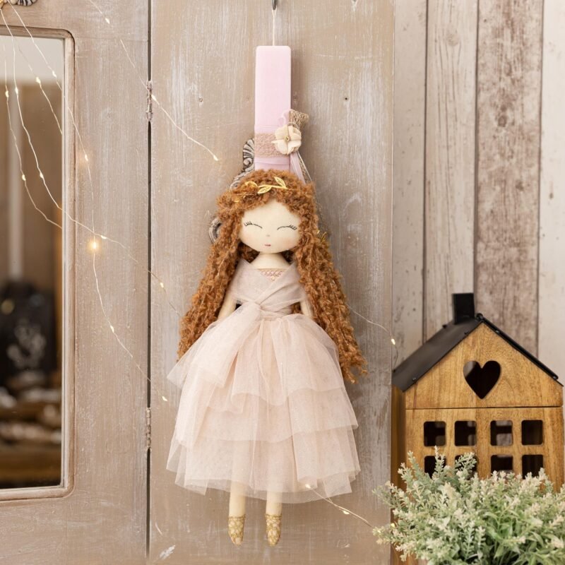 Παιδική λαμπαδα με χειροποίητη κούκλα στα 40 εκ.  περίπου, σε πλακέ αρωματικό κερί στα 34 εκ.