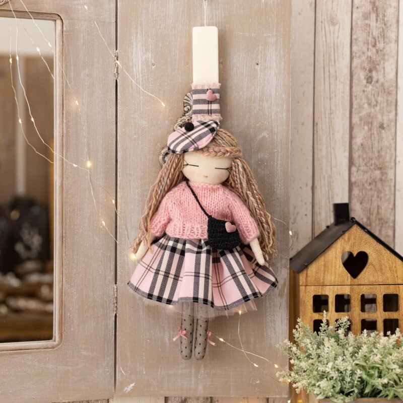 Παιδική λαμπαδα με χειροποίητη κούκλα στα 40 εκ.  περίπου, σε πλακέ αρωματικό κερί στα 34 εκ.