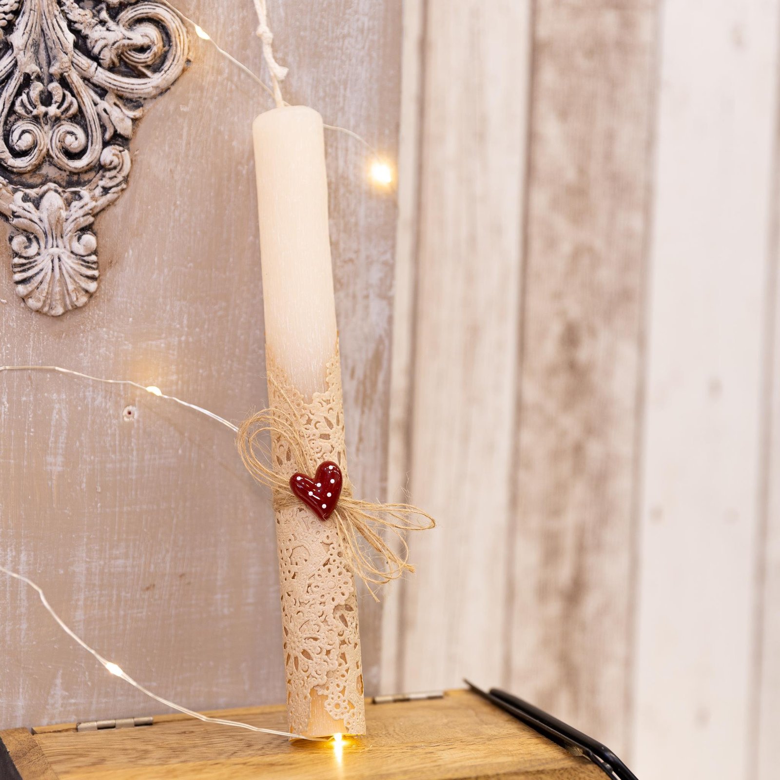 Χειροποίητη αρωματική λαμπάδα διακοσμημένη με δαντέλα και καρδούλα στα 25 εκ.